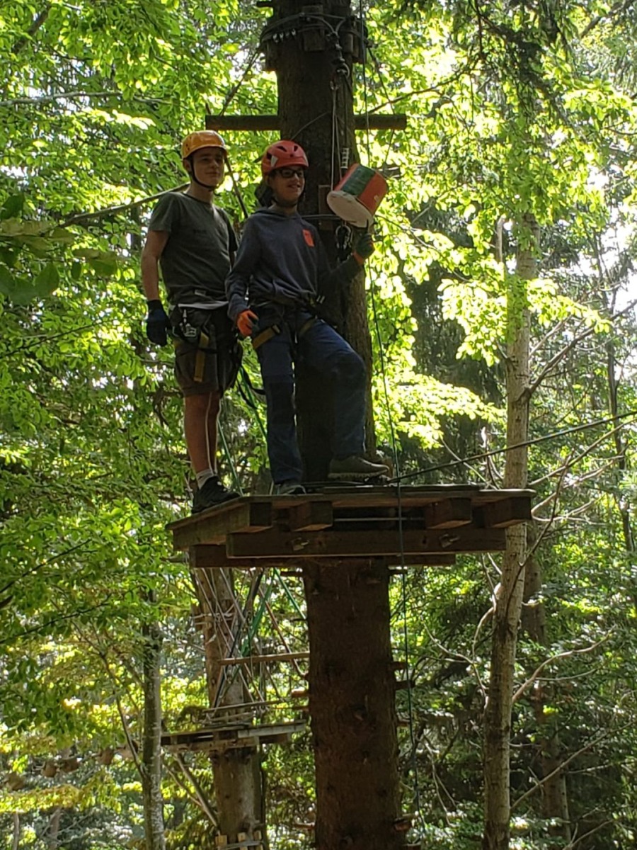 Bei bestem Wetter und Sonnenschein konnten nach einer kurzen Einführung durch das liebenswerte Betreuerteam bereits die ersten Parcours gemeistert werden. Einradfahren von einem Baumwipfel zum anderen, über ein Hausdach schweben und in luftigen Höhen durch Ringe klettern – all das und vieles mehr zählte zu den Herausforderungen an diesem Tag. Und für den nötigen Schwung sorgten dann noch die wilden Ritte am Flying Fox.