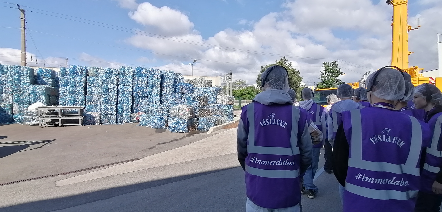 Nach einem kleinen Einführungsvideo sowie der notwendigen Sicherheitseinweisung wurde die Klasse mit Warnwesten und Audioguides ausgestattet und durch das Gelände geführt. Die Schüler:innen erhielten dabei Informationen über die Geschichte der Mineralwasserquelle, zum Kunststoffrecycling und bekamen Einblicke in die Arbeitsprozesse des Betriebs.