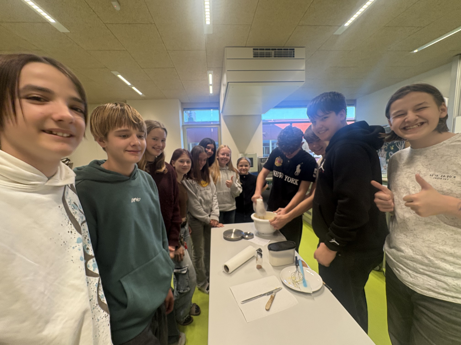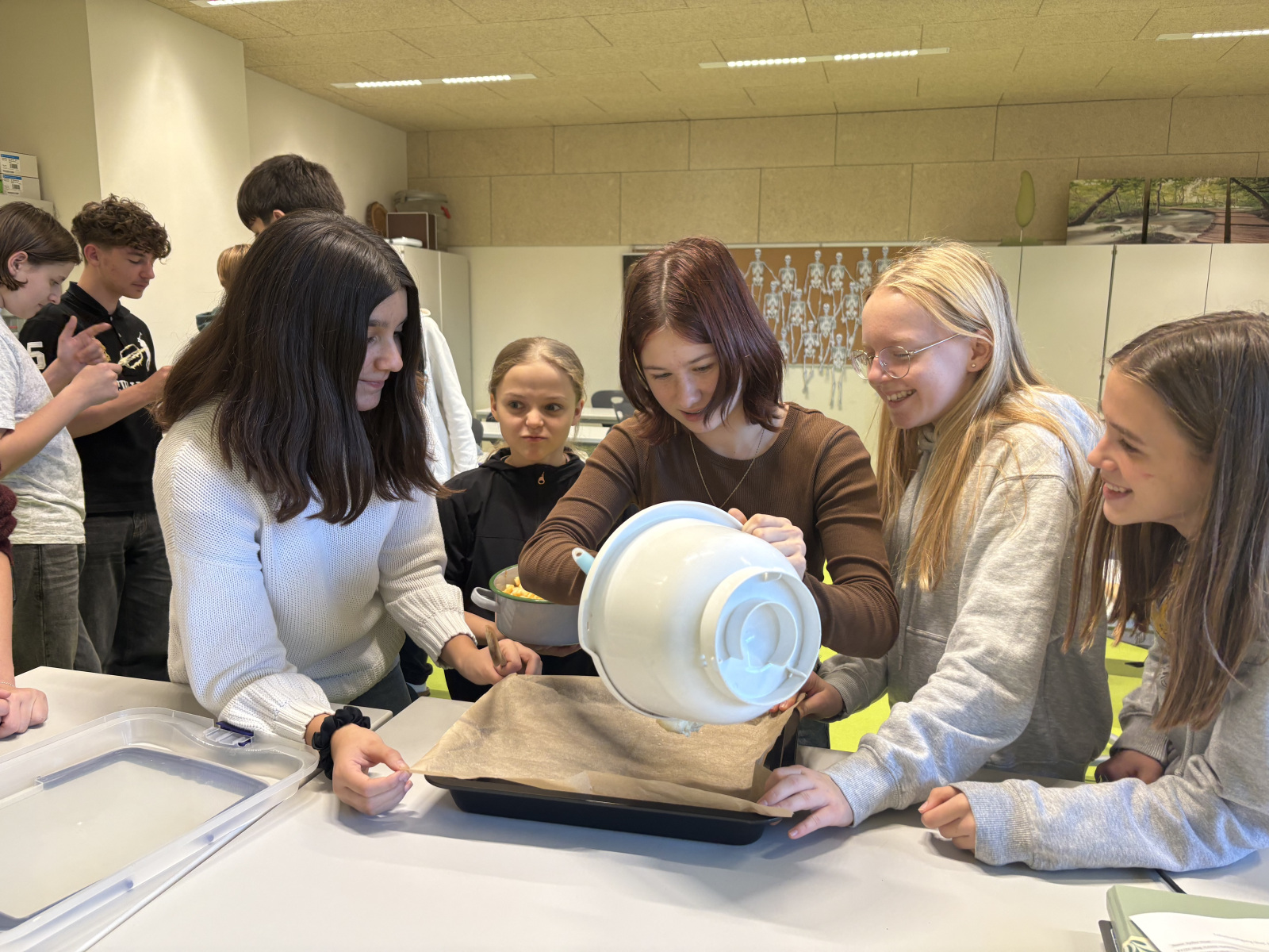 Anlässlich des Tages des Apfels am zweiten Freitag im November widmete sich die 4F im Biologie-Labor ganz dieser besonderen Frucht. Mit großem Interesse untersuchten die Schülerinnen und Schüler den Aufbau des Apfels, erfuhren Spannendes über seine Inhaltsstoffe und diskutierten, warum der Apfel als regionales Superfood gilt. Zum Abschluss wurde aus der Theorie köstliche Praxis: Gemeinsam backte die Klasse einen duftenden Apfelkuchen – ein perfekter Abschluss für eine lehrreiche und genussvolle Biologiestunde!