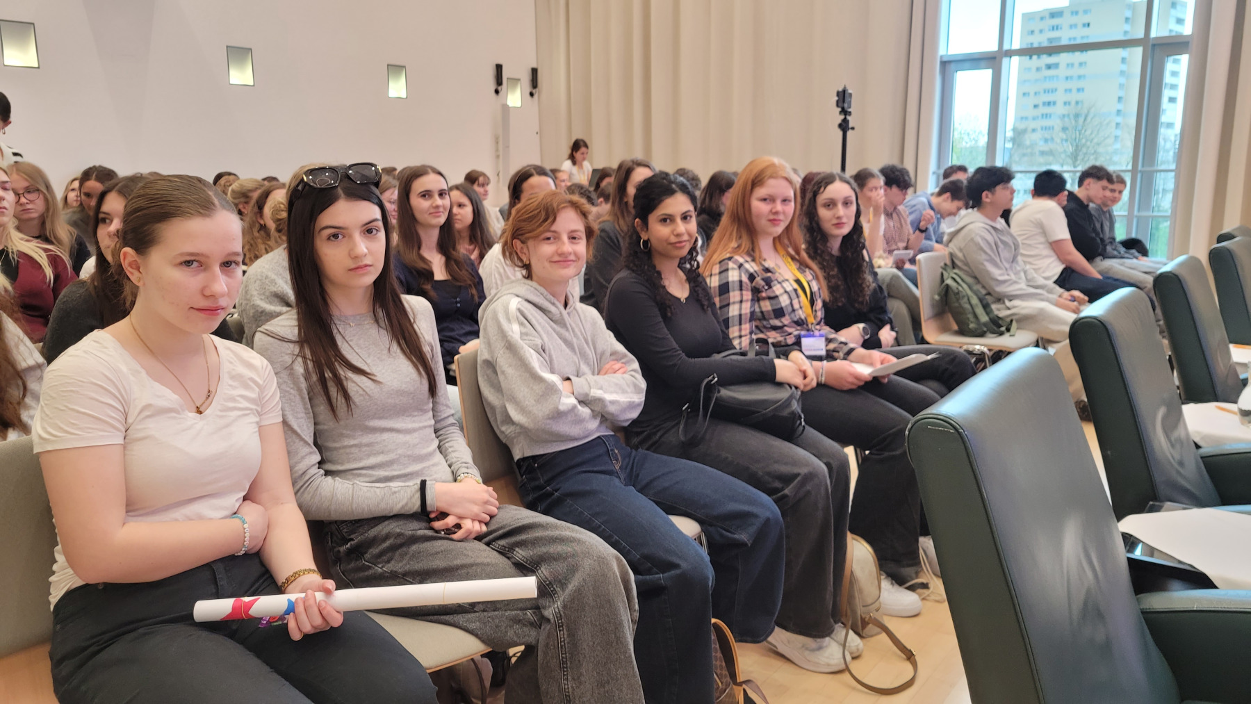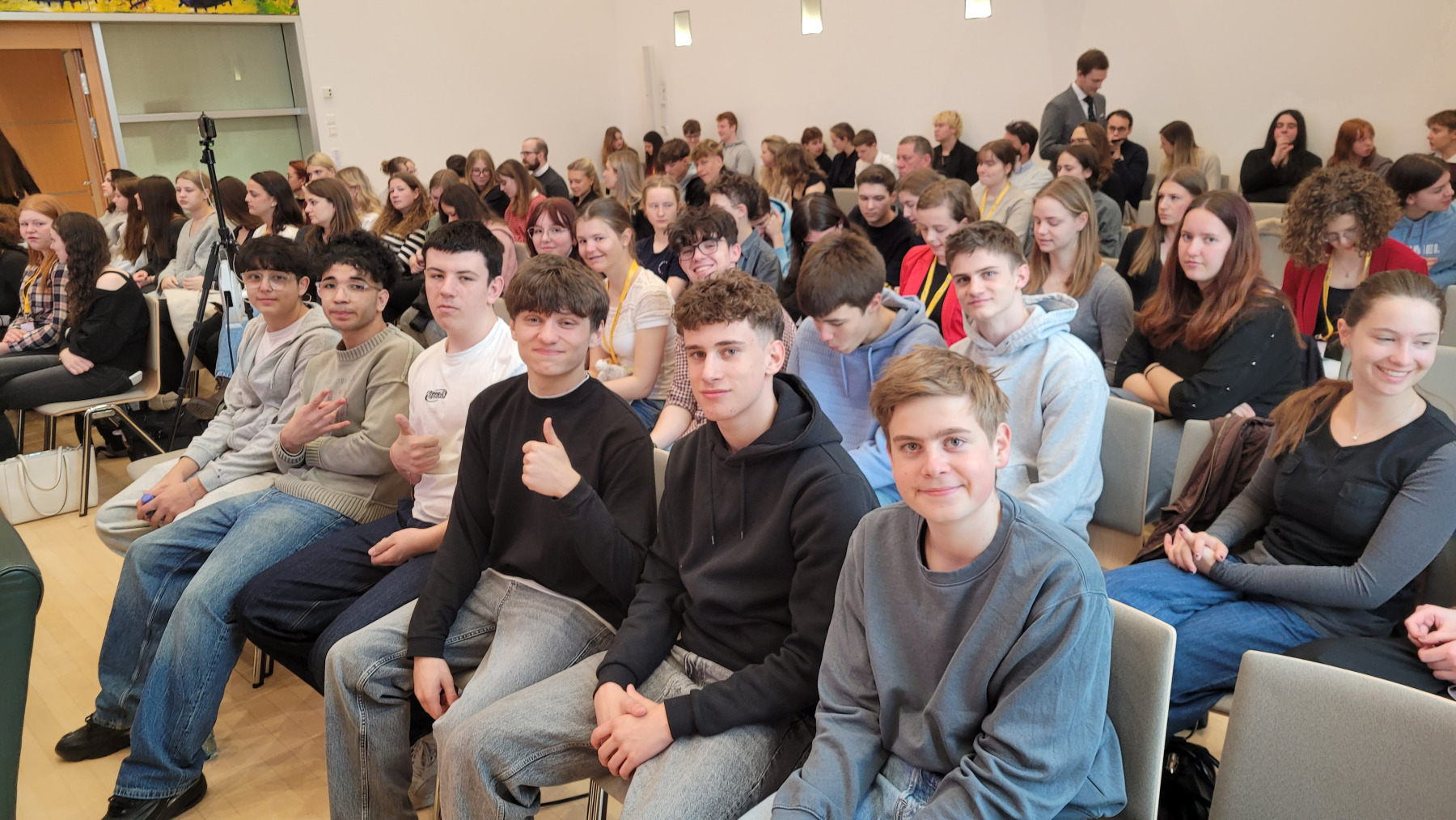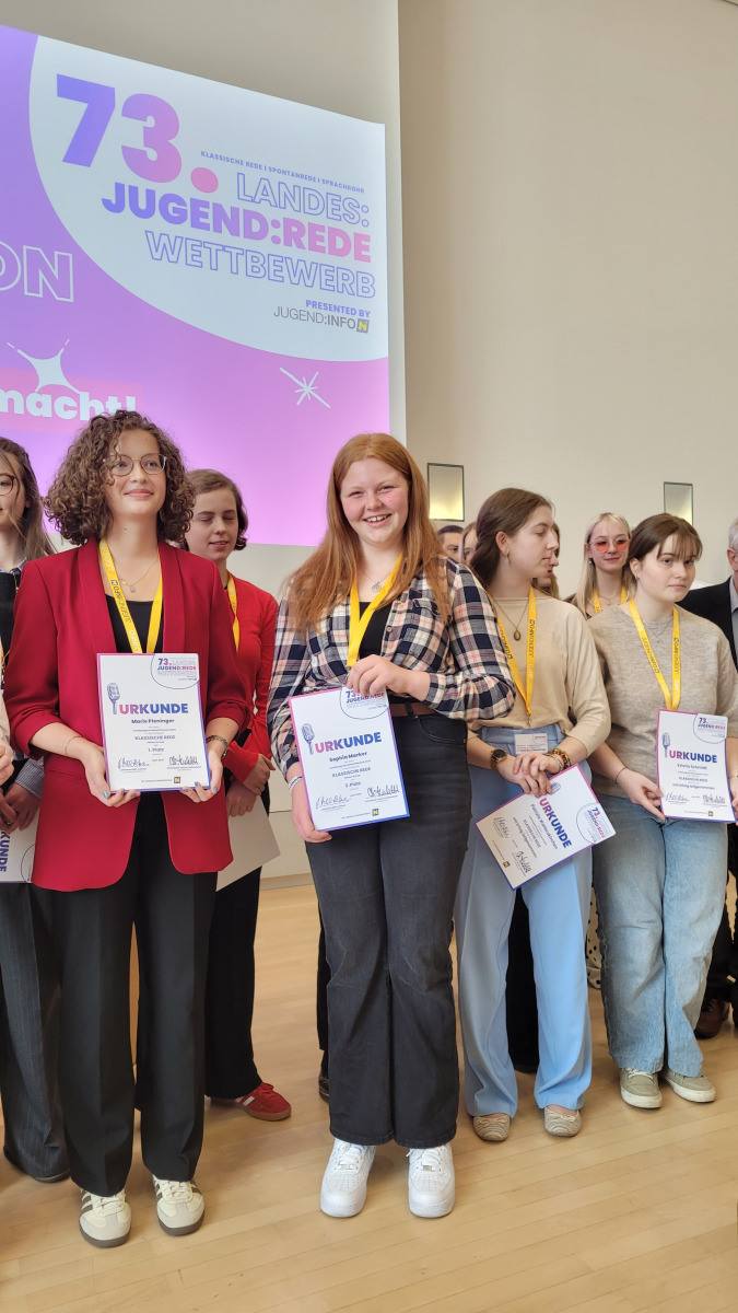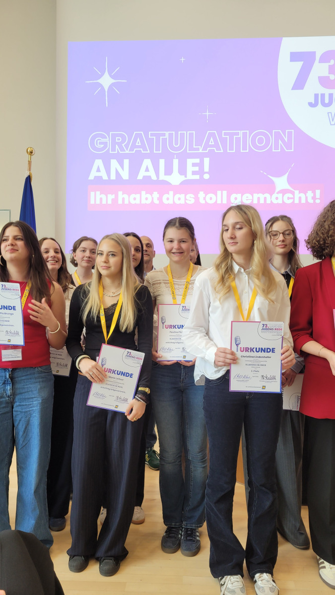 Für unsere Schule gingen Sophia Marker mit dem Thema „Notensystem“ sowie Paulina Pichler mit ihrer Rede über das „Schulsystem“ (beide 6cl) an den Start. Begleitet wurden die Mädels von ihrer Deutschlehrerin Prof. Palta-Göktaş sowie von ihren Klassenkolleg:innen, die sie tatkräftig unterstützten.
