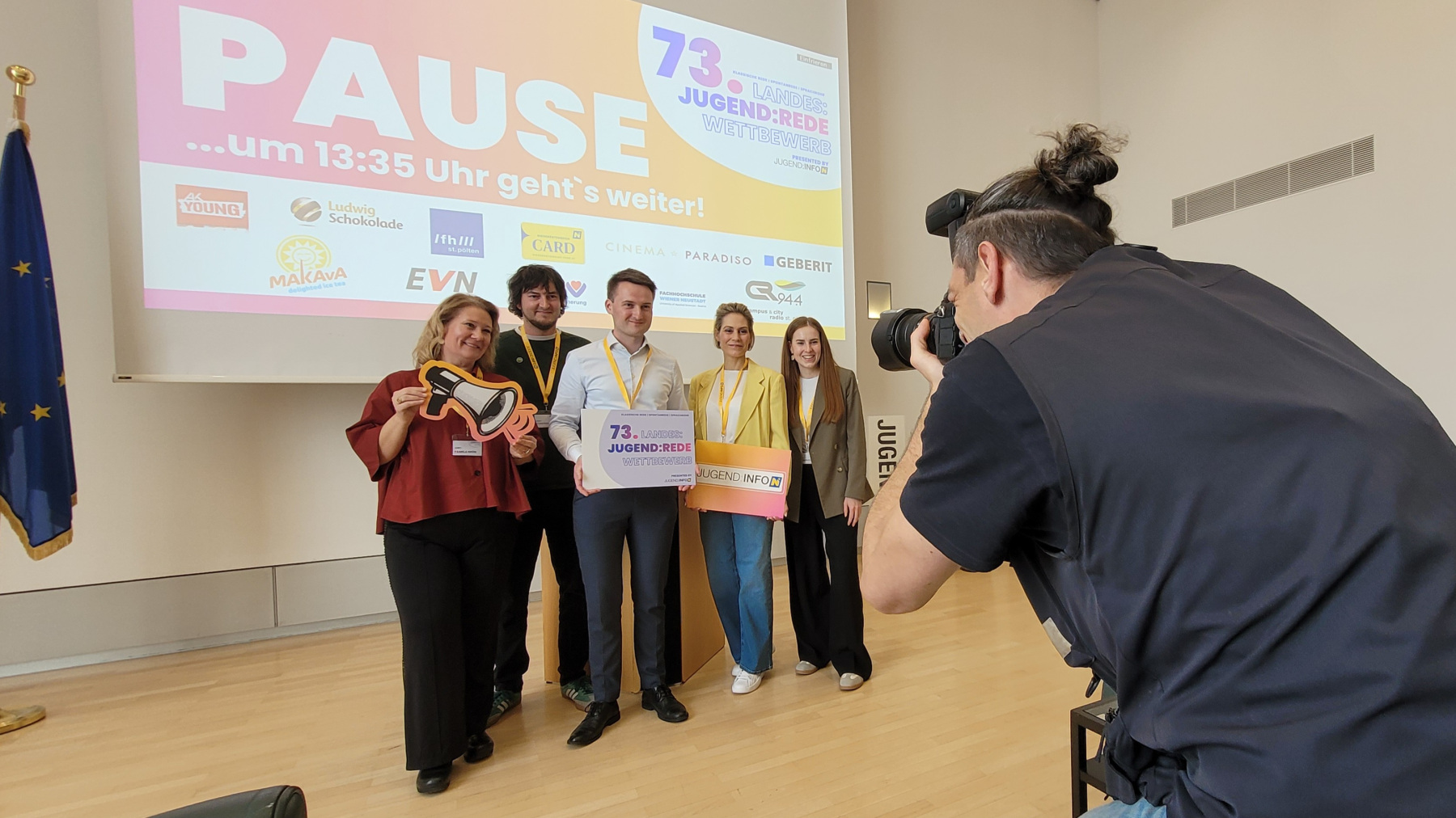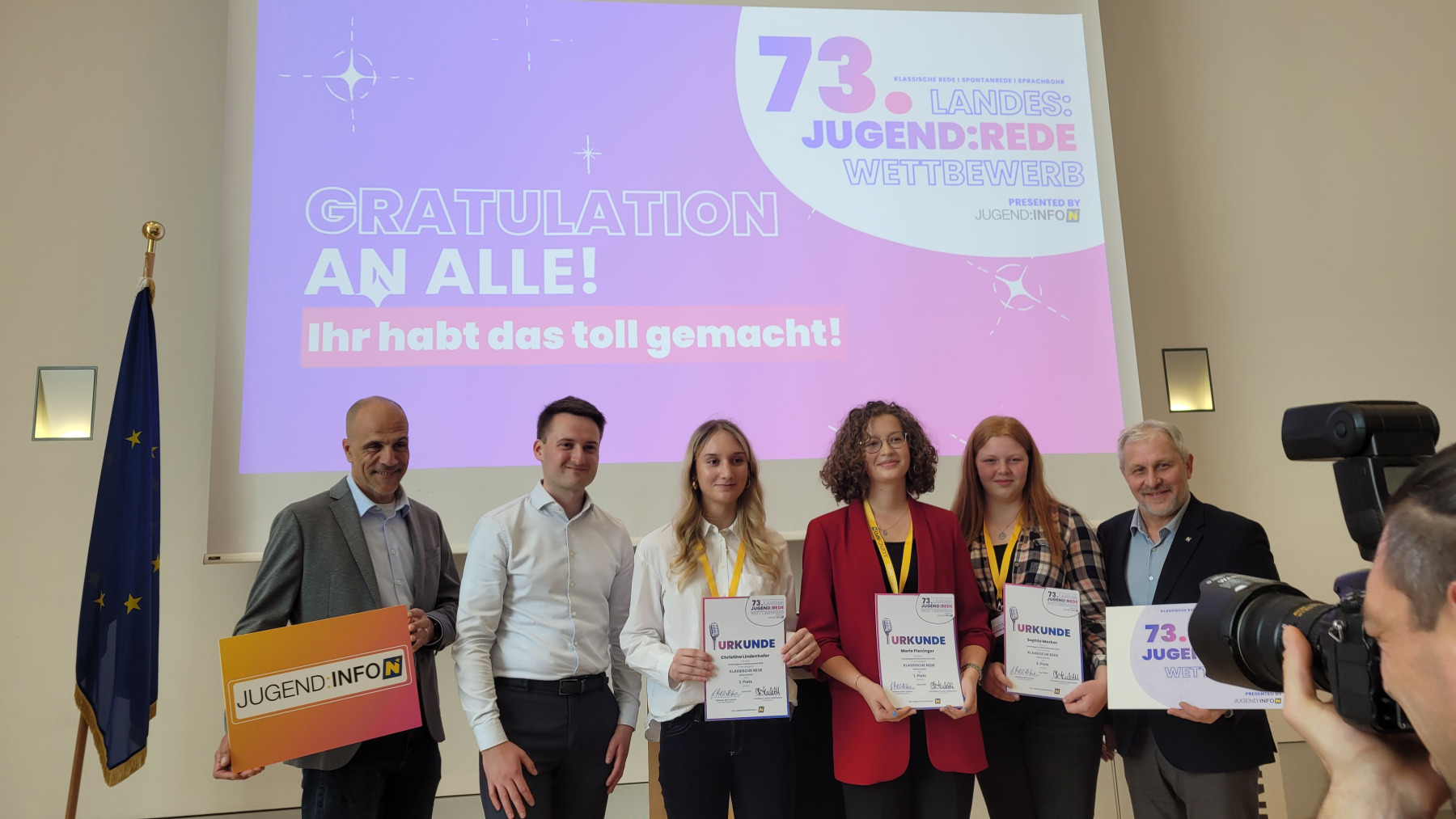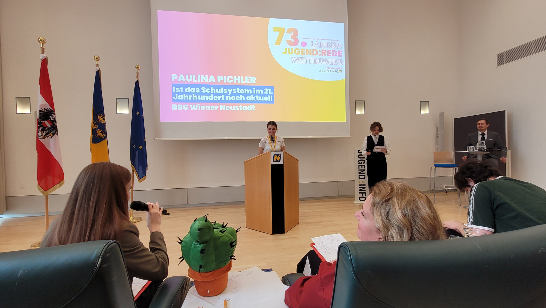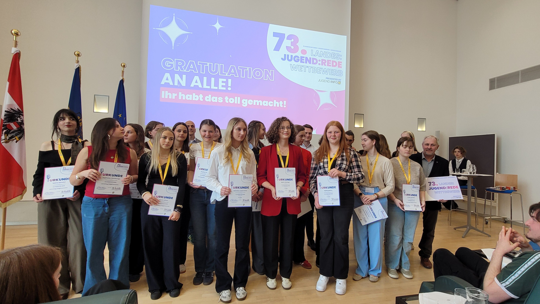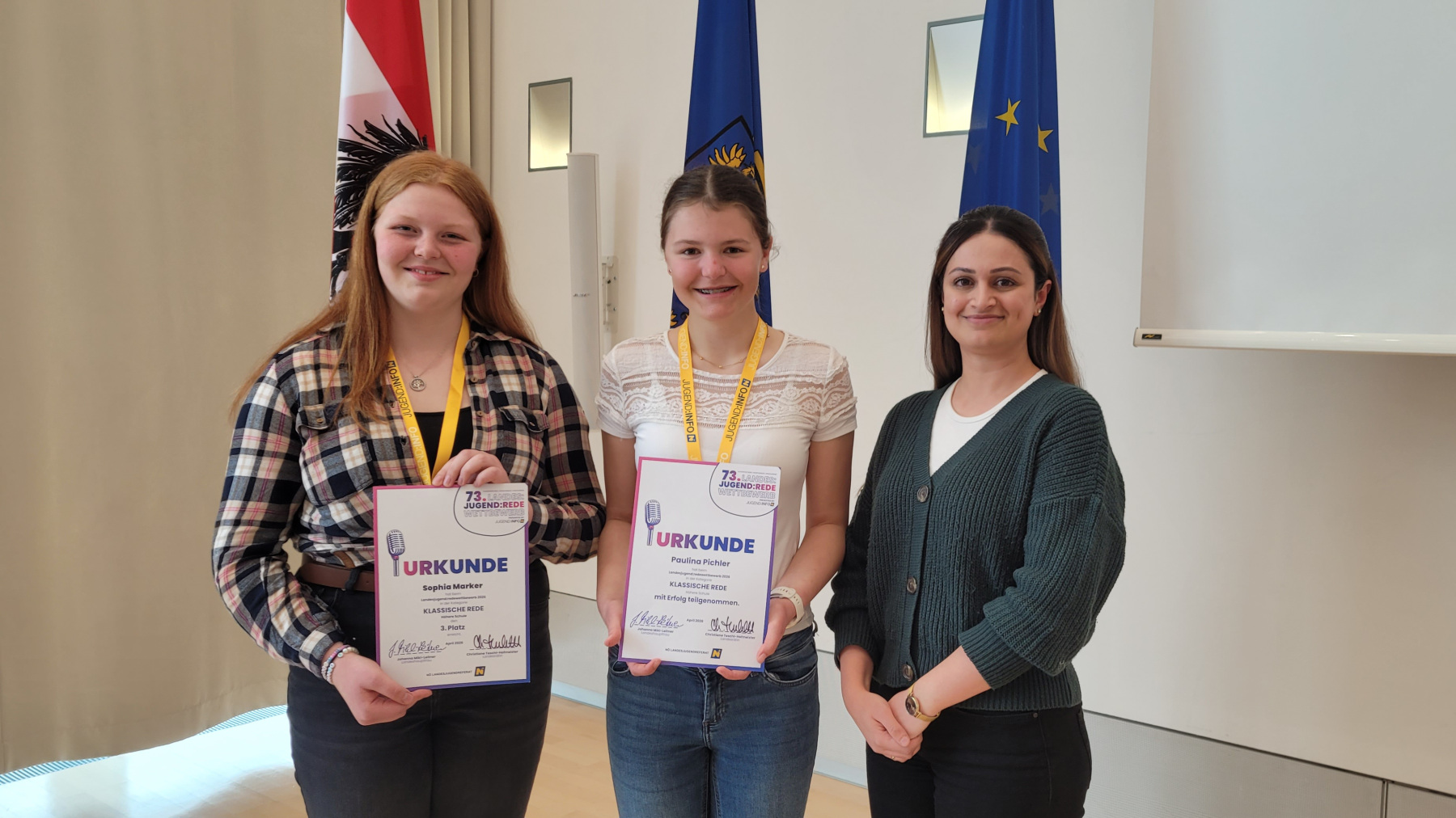 Die beiden Rednerinnen überzeugten mit ihren durchdachten Inhalten, ihrer Ausdrucksstärke und ihrer Bühnenpräsenz. Auch die Fragen der Jury – bestehend aus Elias Pirker (Leiter von Europe Direct NÖ), Julia Schütze (ORF-Radiomoderatorin), Magdalena Polsterer (Bundesjugendvertretung), Pamela Grün (Kommunikations- und Sprechtrainerin) und Heimo Schaupp (Jugend und Lebenswelt) – meisterten sie souverän und überzeugend. Das Publikum zeigte sich ebenso begeistert von den Darbietungen.