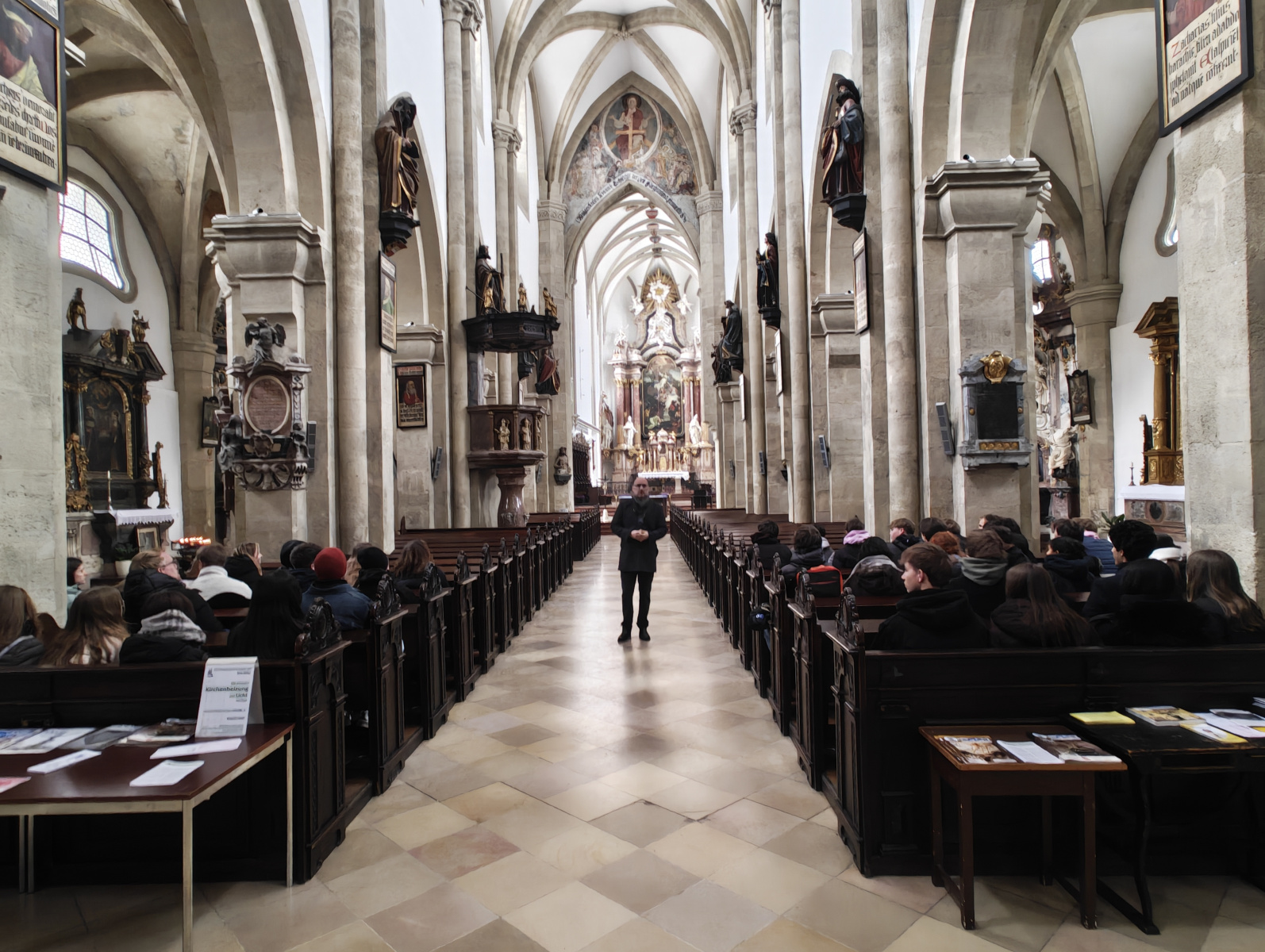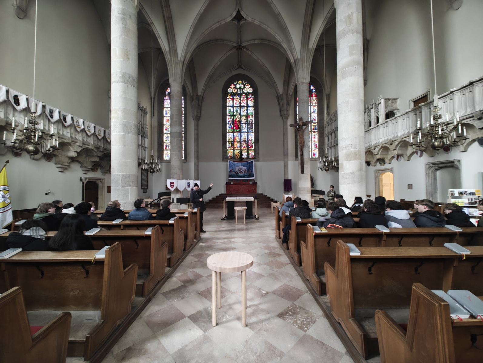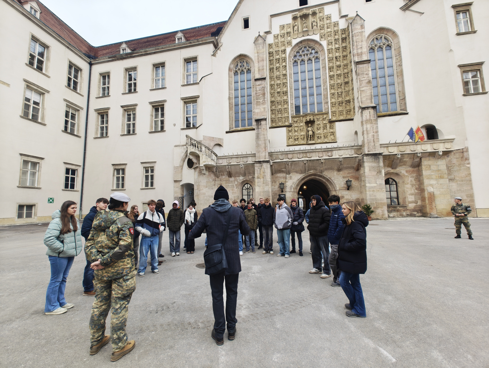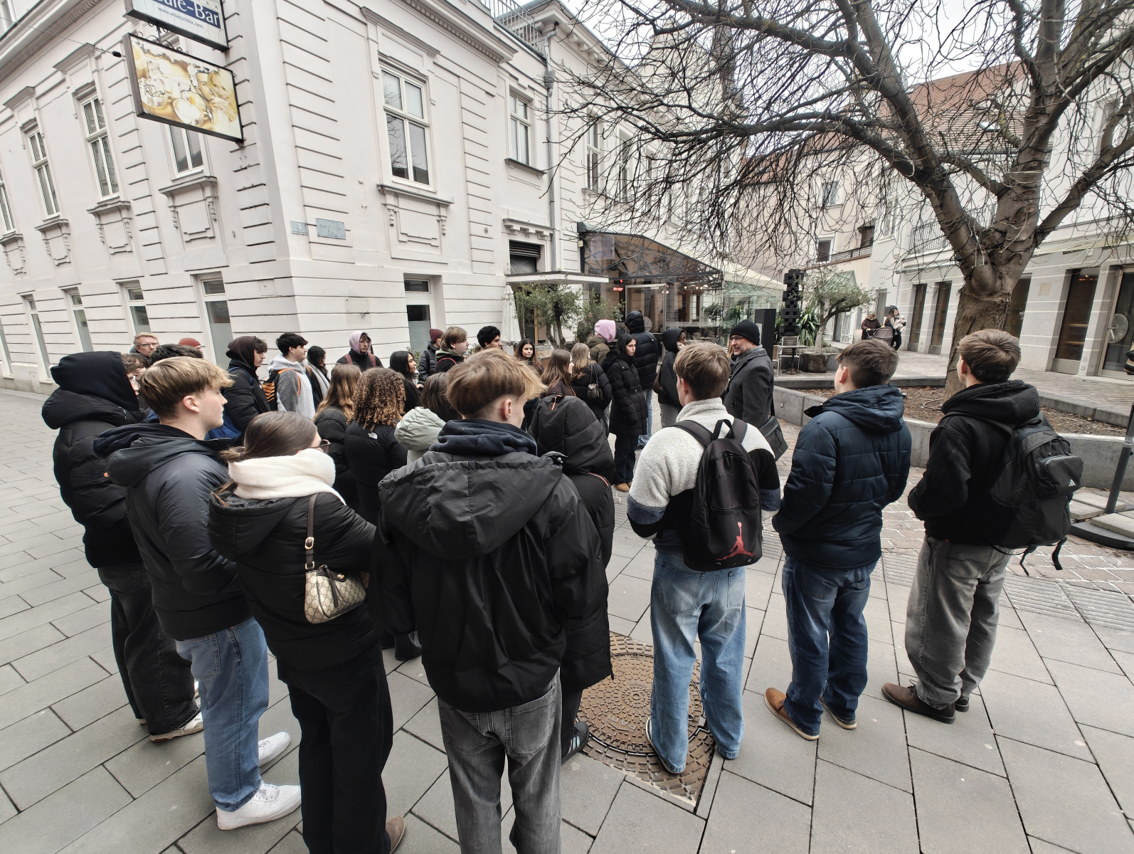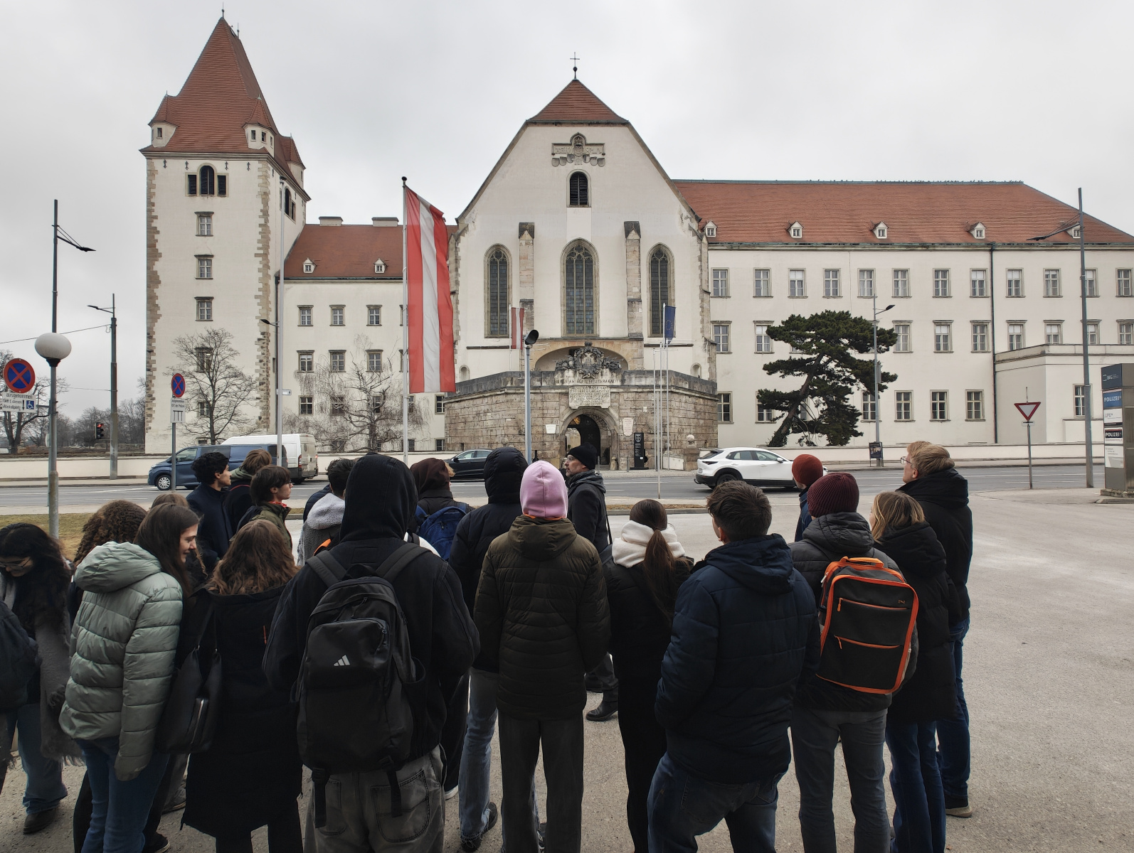 Ein besonderes Highlight war die anschließende Stadtführung. Werner Sulzgruber, Experte für die Regionalgeschichte und Klassenvorstand der 7bl, führte die Gruppe gekonnt zu den Wahrzeichen der Stadt – vom Reckturm über den Dom bis zur Militärakademie. Die Mittagspause bei „Würstel Wilczek“ am Hauptplatz bot die nötige Stärkung, bevor der Abend eine unerwartete Wendung nahm: Ein massiver Wintereinbruch verwandelte die Stadt in eine Schneelandschaft und forderte die Flexibilität der Organisatoren.