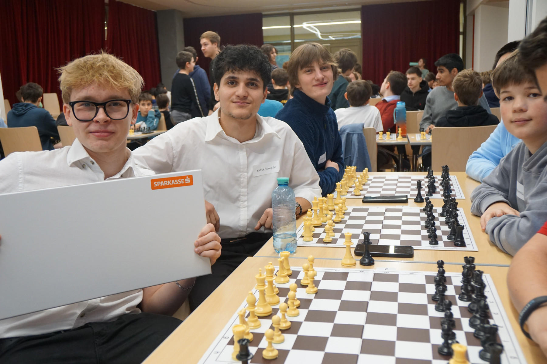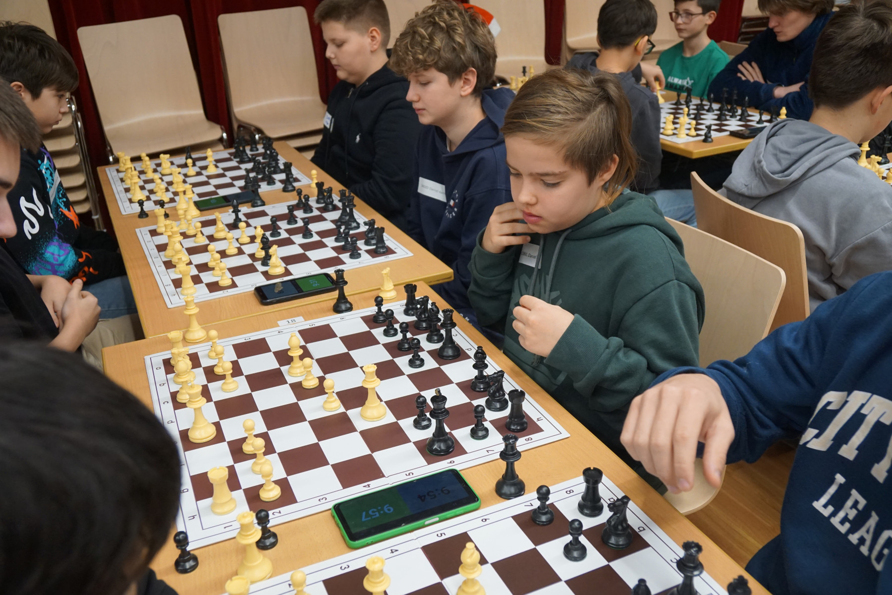 1504 weiße und schwarze Figuren standen ordentlich aufgereiht auf ihren Brettern. Um 8:30 Uhr war es soweit: 96 Schülerinnen und Schüler stürmten in den Mehrzweckraum und suchten das ihnen zugeloste Brett. Nur mit halbem Ohr konnten sie den Worten des Schiedsrichters zuhören – zu groß war die Aufregung, die hoch der Lärmpegel. Aber als dann die Aufforderung ertönte – „Reicht einander die Hände! Schwarz betätigt die Schachuhr! Weiß zieht!“ – kehrte augenblicklich absolute Ruhe ein. In höchster Konzentration und in den meisten Fällen auch mit beachtlichem Können wurden die Figuren bewegt. Dann wenige Minuten später verkünden Enttäuschungsseufzer und verhaltenen Freudenrufe das Ende der ersten Runde.