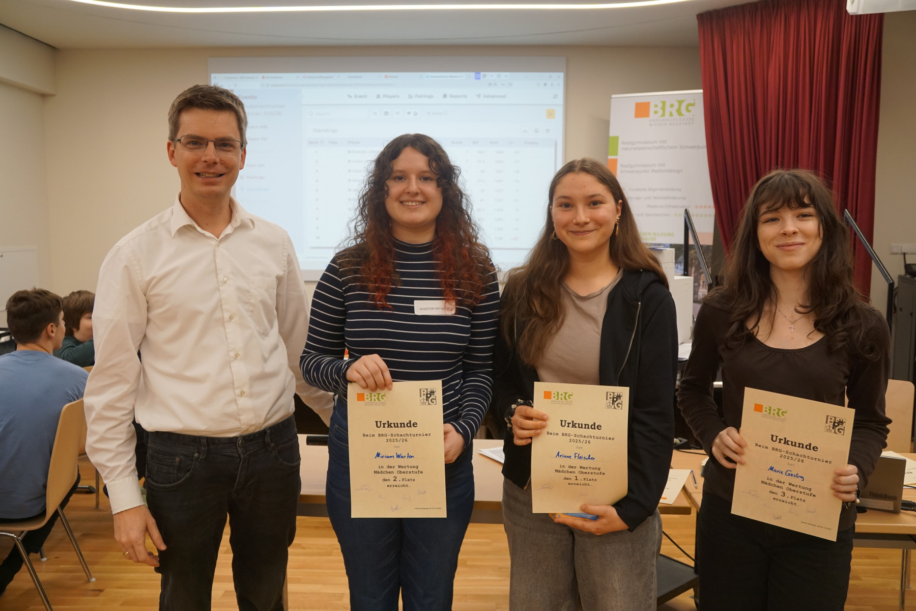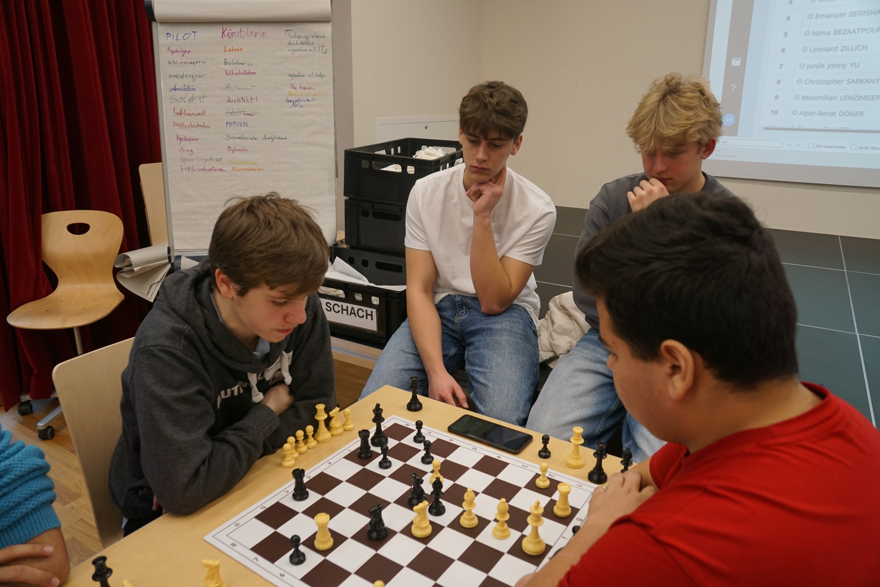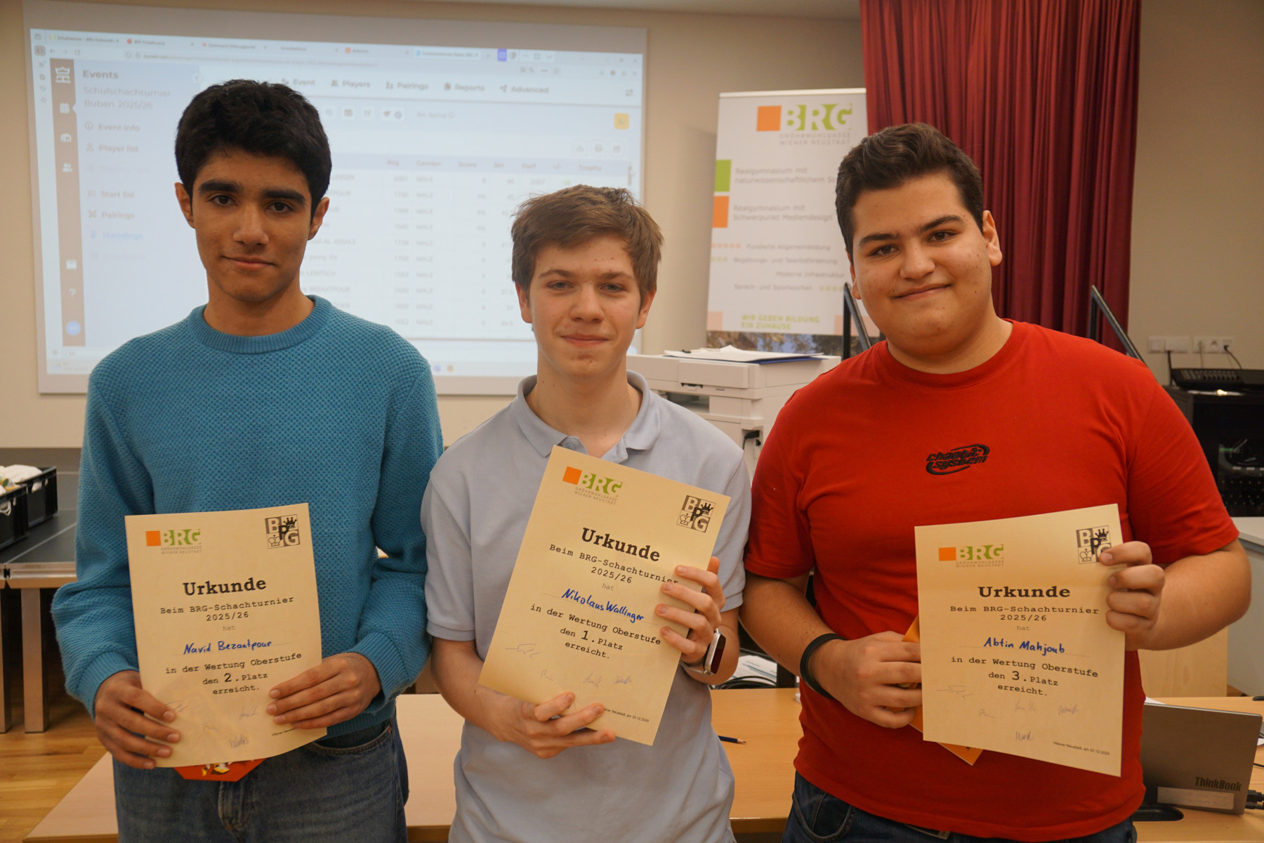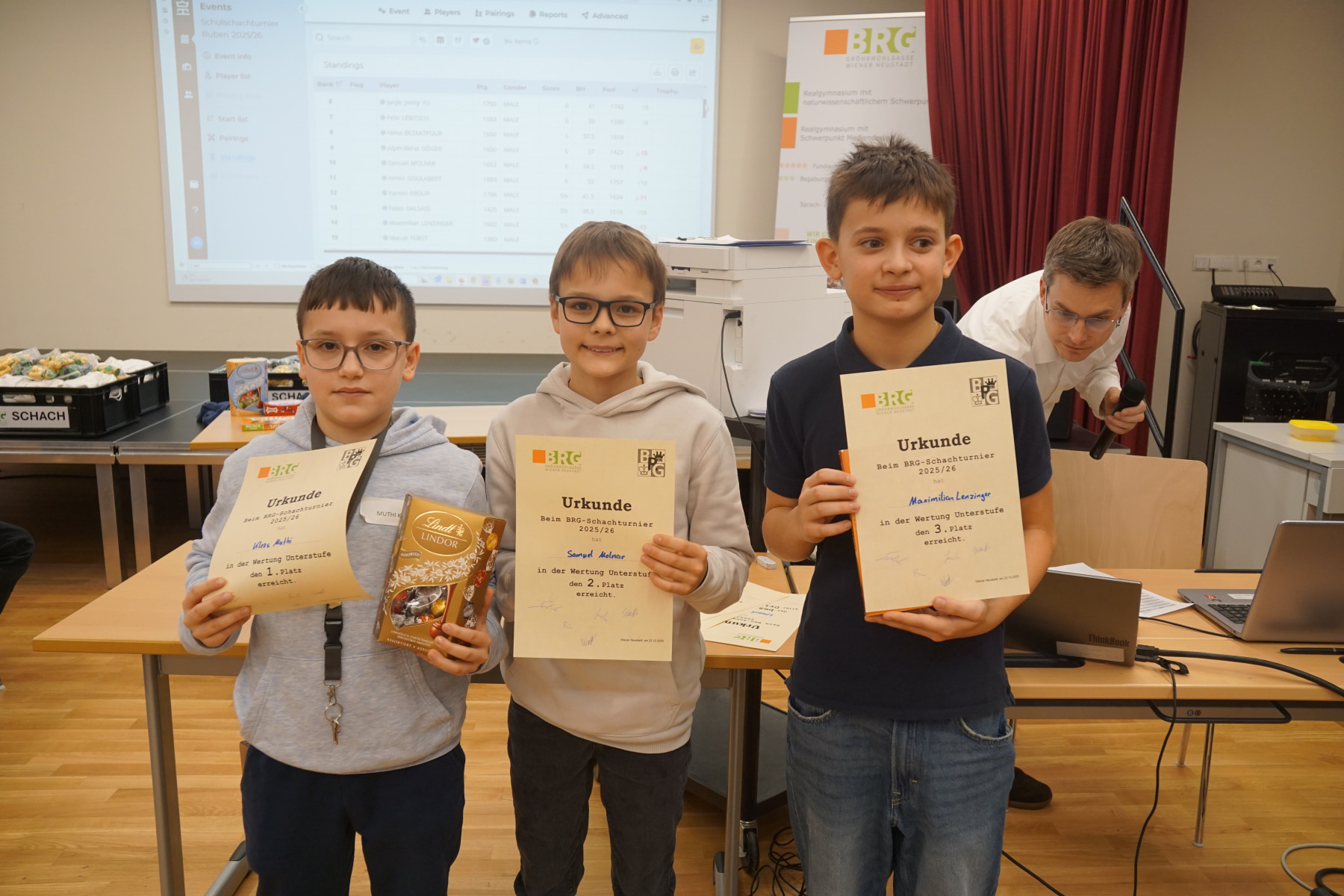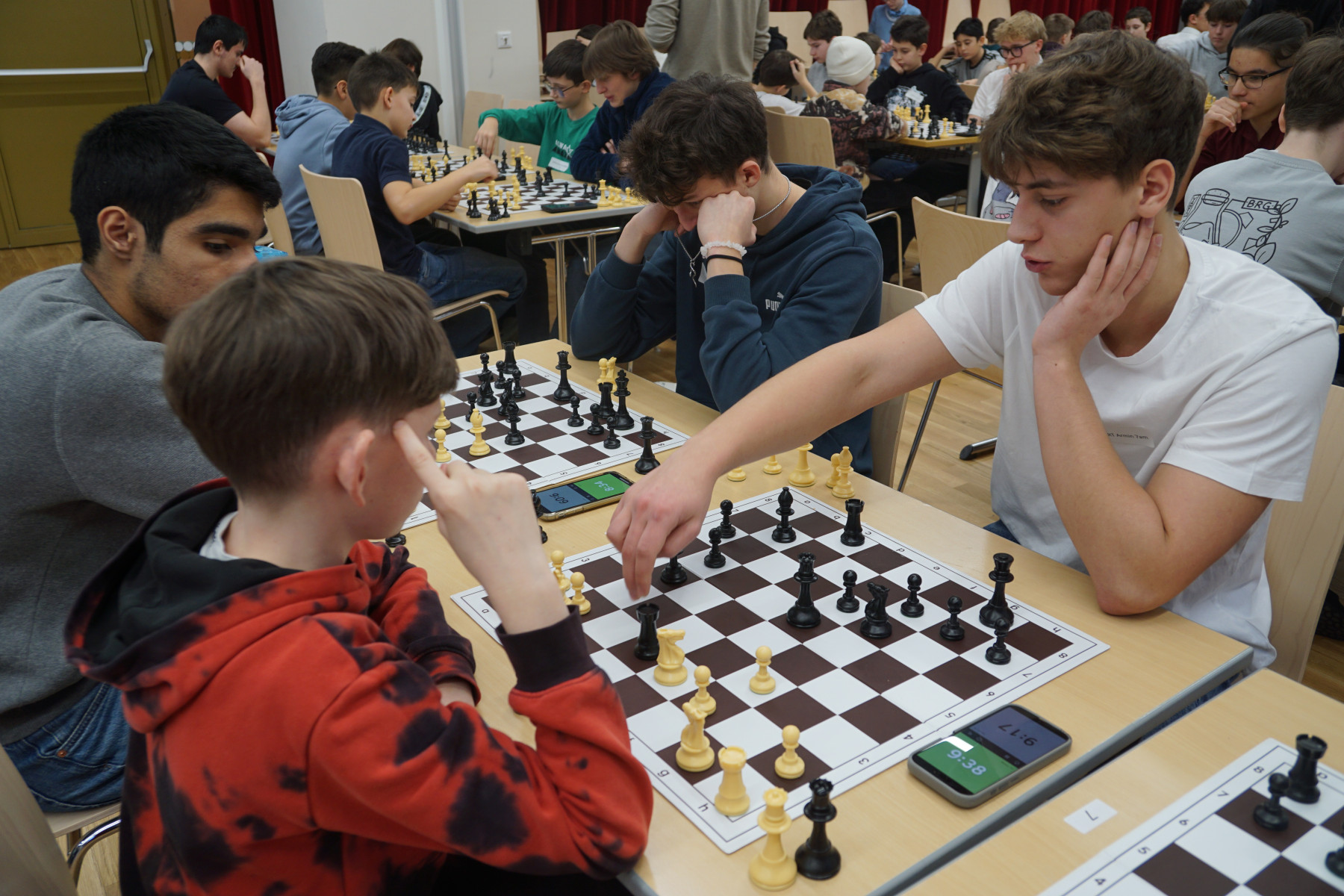 Es folgten Dokumentation der Ergebnisse, Neuauslosung und Verkündigung der Aufstellung der 2. Runde. In dieser Manier ging das Schachturnier insgesamt 8 Runden weiter. Unter der Aufsicht der Professoren Klemens Reidlinger, Bernhard Schuh, Jakob Wanko, Jonas Weber und Patrick Wöckl spielten 16 Mädchen der Unter- und Oberstufe und 81 Buben der Unter- und Oberstufe gegeneinander.