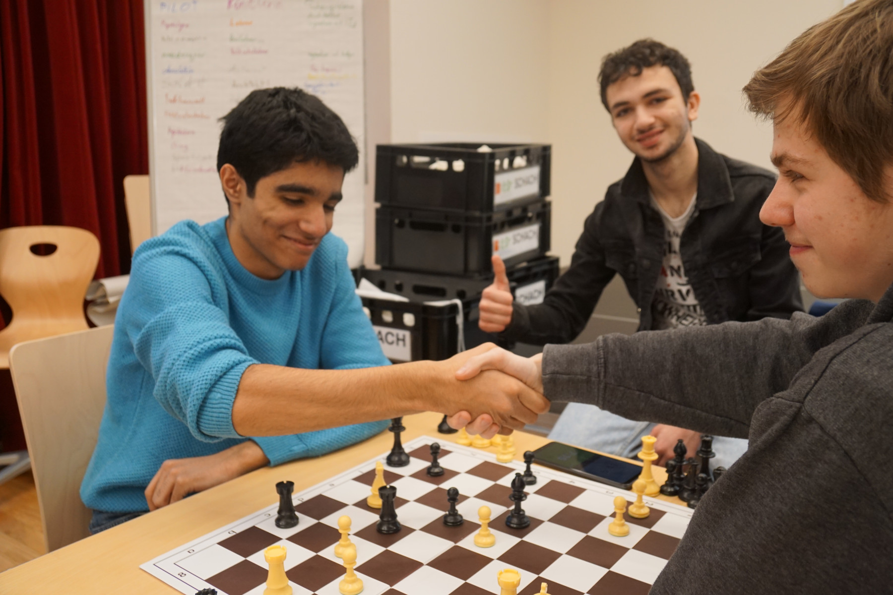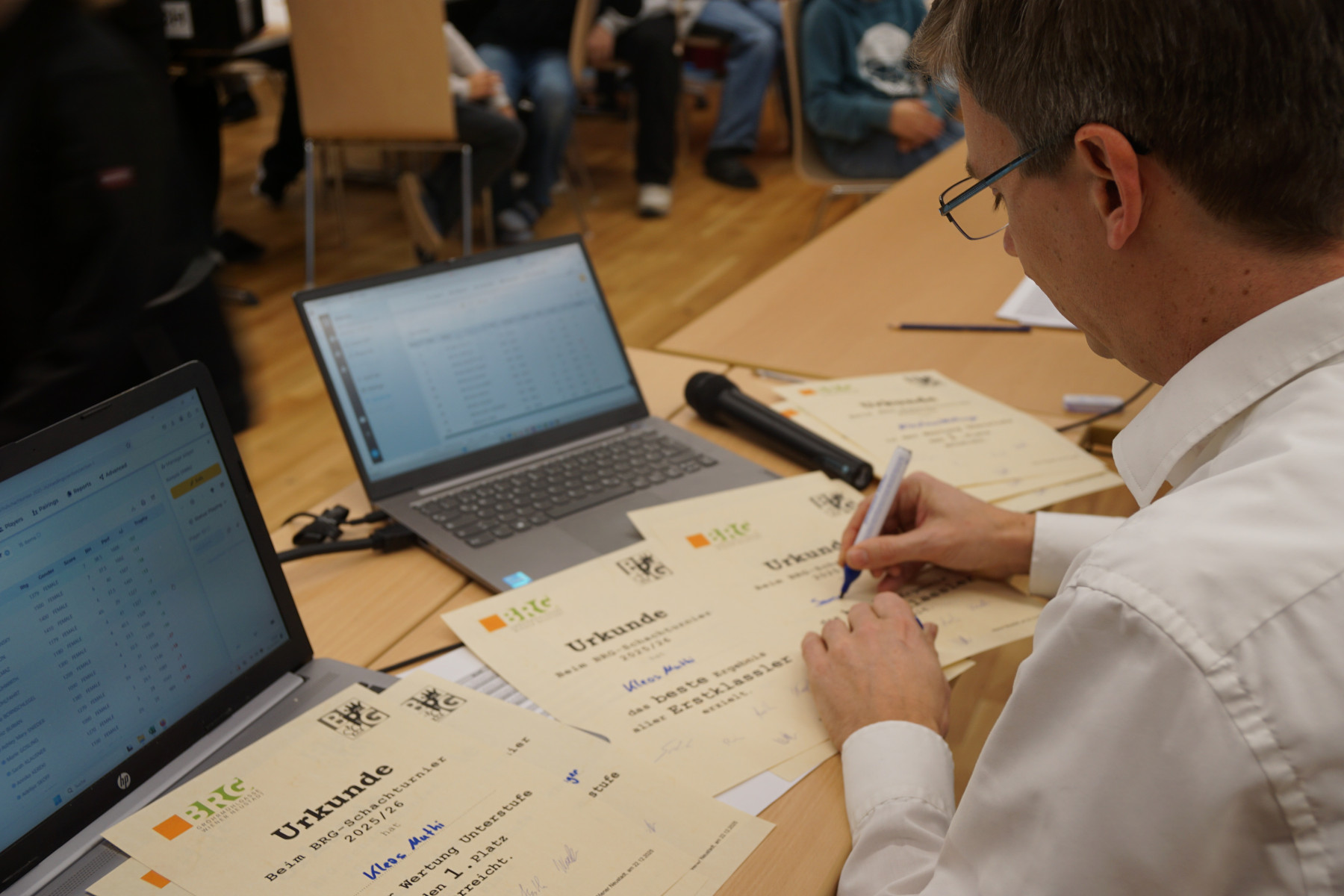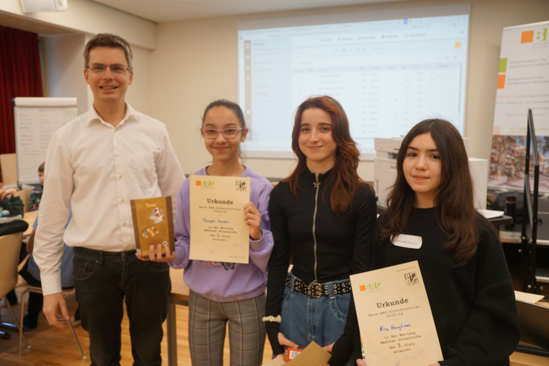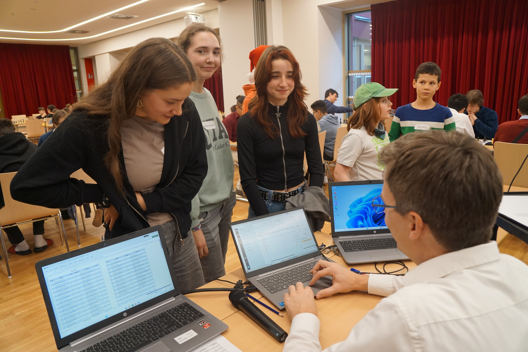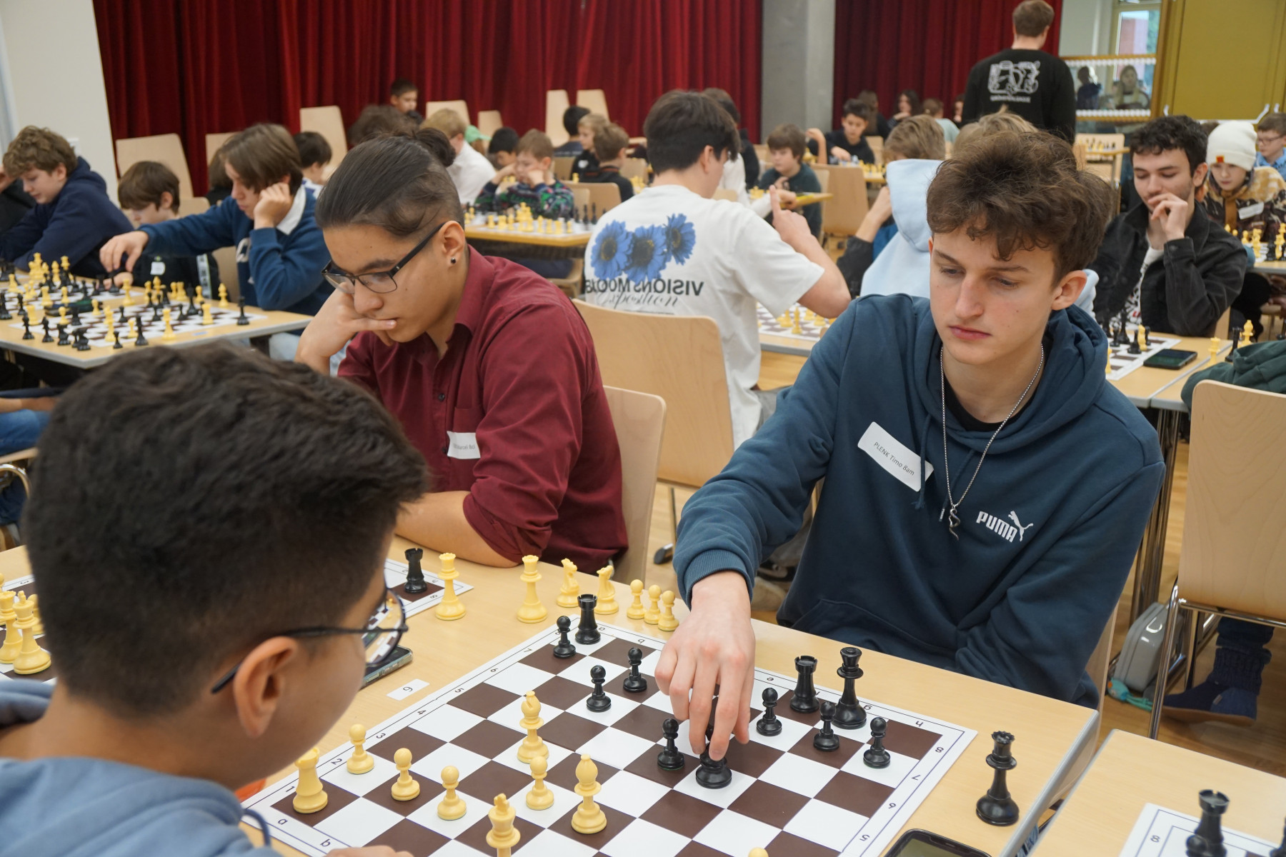 Es folgten Dokumentation der Ergebnisse, Neuauslosung und Verkündigung der Aufstellung der 2. Runde. In dieser Manier ging das Schachturnier insgesamt 8 Runden weiter. Unter der Aufsicht der Professoren Klemens Reidlinger, Bernhard Schuh, Jakob Wanko, Jonas Weber und Patrick Wöckl spielten 16 Mädchen der Unter- und Oberstufe und 81 Buben der Unter- und Oberstufe gegeneinander.